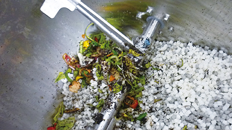 日新アカデミー研修センターと日新倶楽部嵯峨野荘では、食品ロスの削減や減容化を含めた廃棄物の3R(リデュース・リユース・リサイクル)推進に取り組み、使い捨てをしない「ごみゼロ(再資源率化100%)」を目指しています。備品削減やペーパーレス化の推進、ごみの分別ステーションや分別BOXの設置のほか、食事メニューの改正や「30・10運動」の実施による食品ロス削減、生ごみ処理機の導入による食品残渣の削減に取り組んでいます。