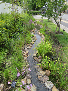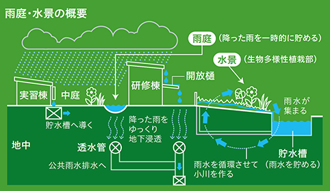 | ※2 | 雨庭:土面に雨水を一時的に貯めて時間をかけて地中に浸透させることで、公共排水への急激な雨水流出を防ぐ機能を備えた庭。公共インフラの負担を軽減し、短時間の集中豪雨による排水溝の氾濫抑制などに貢献できる。 |