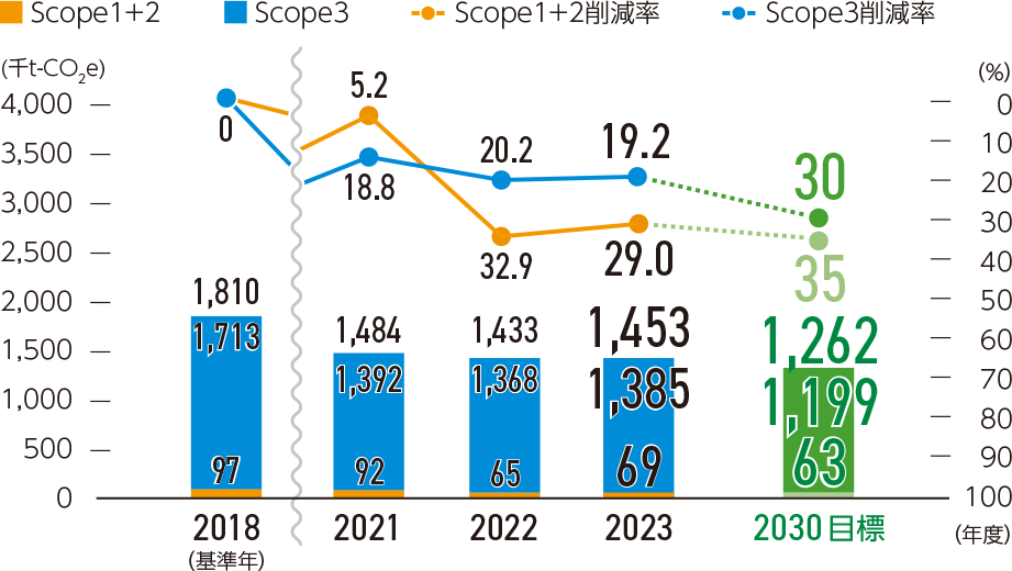 温室効果ガス排出量削減については、2030年度に2018年度比で35%削減(Scope1+2)、30%削減(Scope3)という長期目標を策定し、国際的な環境団体であるSBTイニシアチブ(SBTi:Science Based Targets Initiative)※から科学的根拠に基づいた目標として認定を受けています。