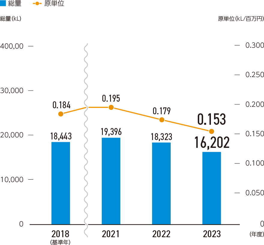 製造拠点のエネルギー使用量と原単位(国内グループ+海外グループ)