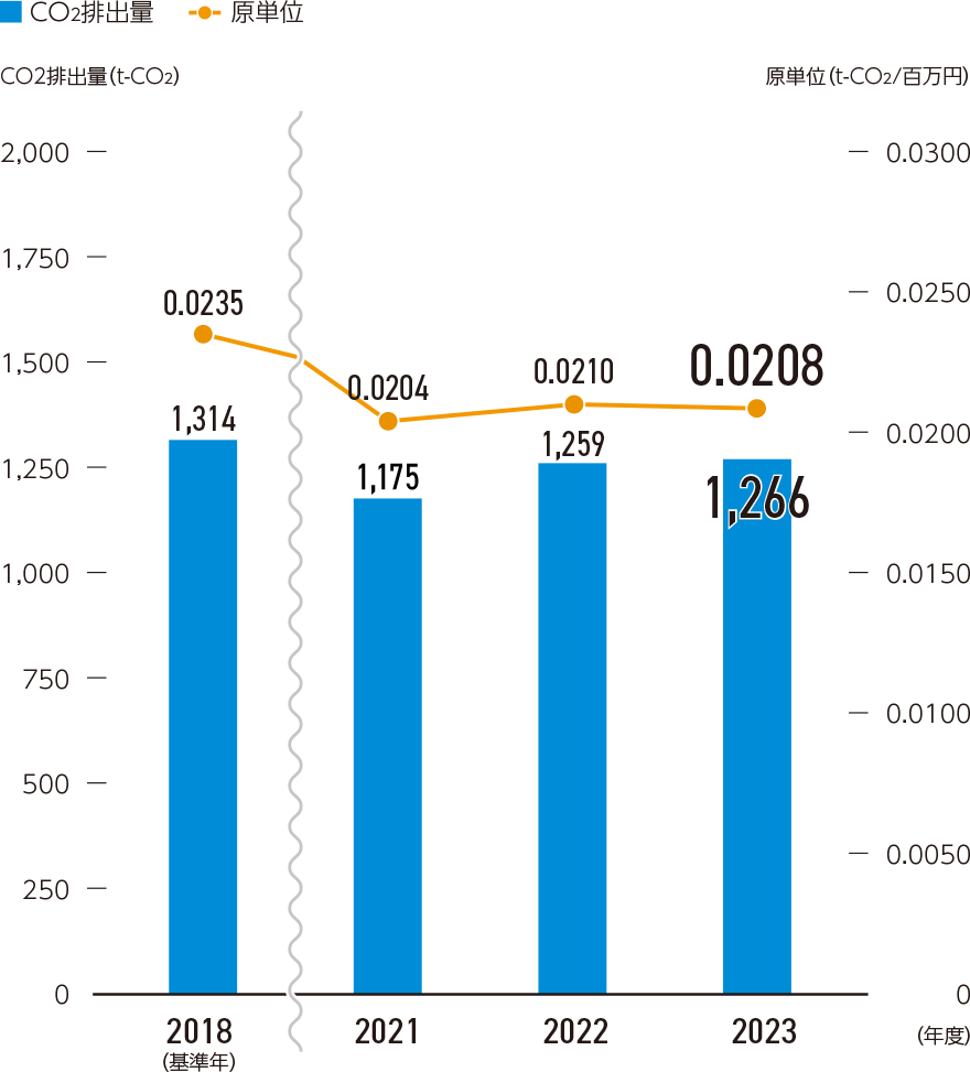 当社の運輸グループでは、駐車時のアイドリングストップなどエコドライブの実施、輸送量の低減やCO2算出乗数の低いトラックの採用ほか、積み込み効率を上げて配車する台数を減らす活動を通じてCO2排出量の削減に取り組んでいます。