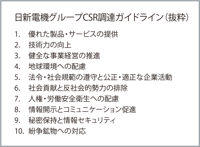 当社では2013年に「日新電機グループCSR調達ガイドライン」を制定し、取引先様に積極的な推進と周知をお願いしています。
