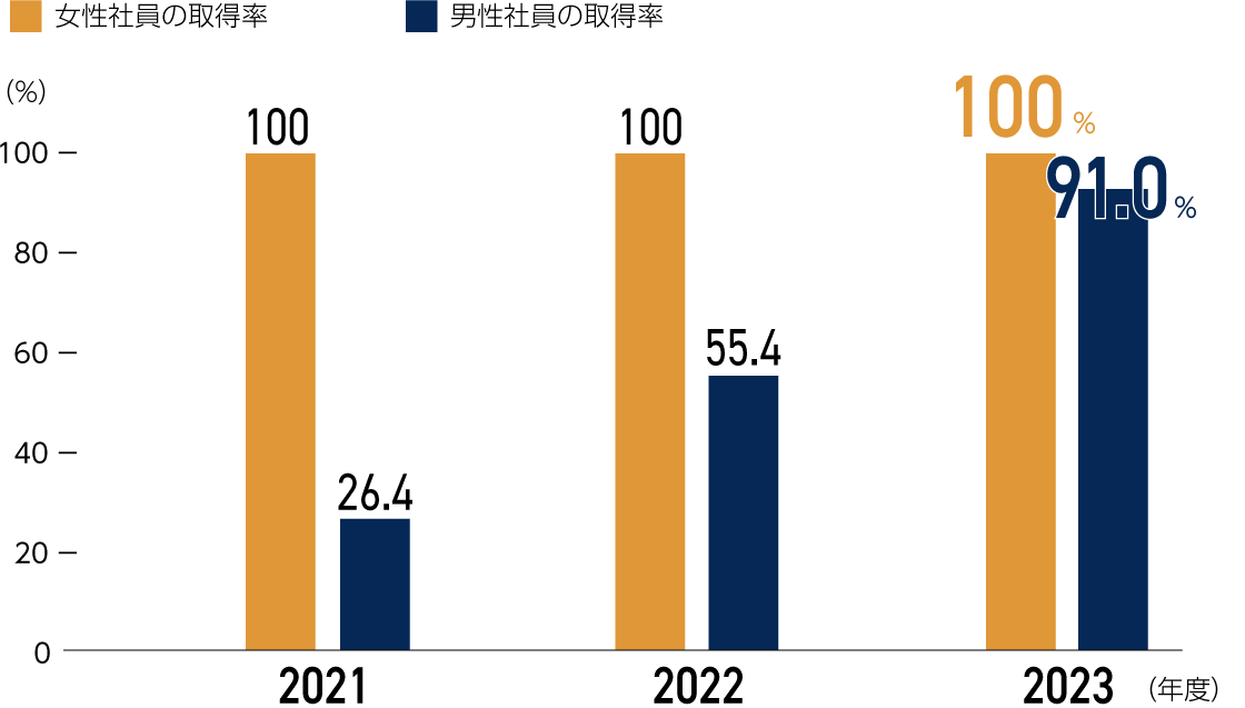 男女問わず仕事と育児を両立できる職場づくりのため、当社では、「女性活躍推進法に基づく行動計画」の目標の一つを「男性育休取得率80%」と定め、男性社員の育児休職制度利用を推進しています。産後サポートや育児分担のための制度利用について前向きに検討できるよう、両立支援制度利用のしおりや社内ウェブサイト内の男性育休ポータルページなどで、男性社員の育休取得体験記の紹介や、育休取得期間・収入・人事評価などに関して詳しく情報提供することにより、制度利用を促すとともに、職場でのサポート体制の整備促進も実施しています。