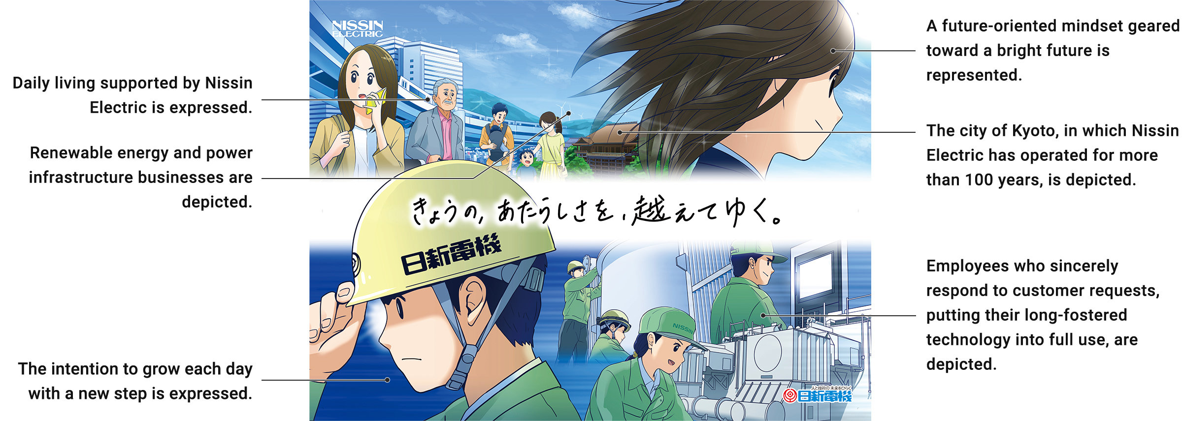 The brand message "Beyond Today, Brighter Tomorrow" verbalizes the important wishes of Nissin Electric.