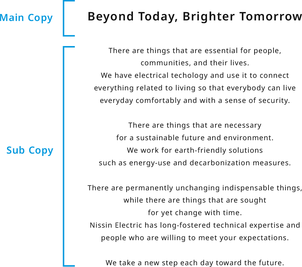 The brand message is comprised of two parts: a main copy and a sub copy. The main copy expresses Nissin Electric's wishes and belief with originality, while the sub copy, which complements the main copy, expresses relationships between its business and society and its accomplishments.