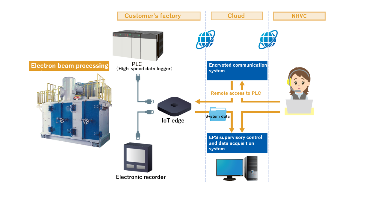 Key EPS data (accelerating voltage, electron current, vacuum level, etc.) stored on the cloud is monitored, and if a set threshold is exceeded, the customer and NHVC will be notified by email. This enables preventive maintenance and contributes to stable operation.