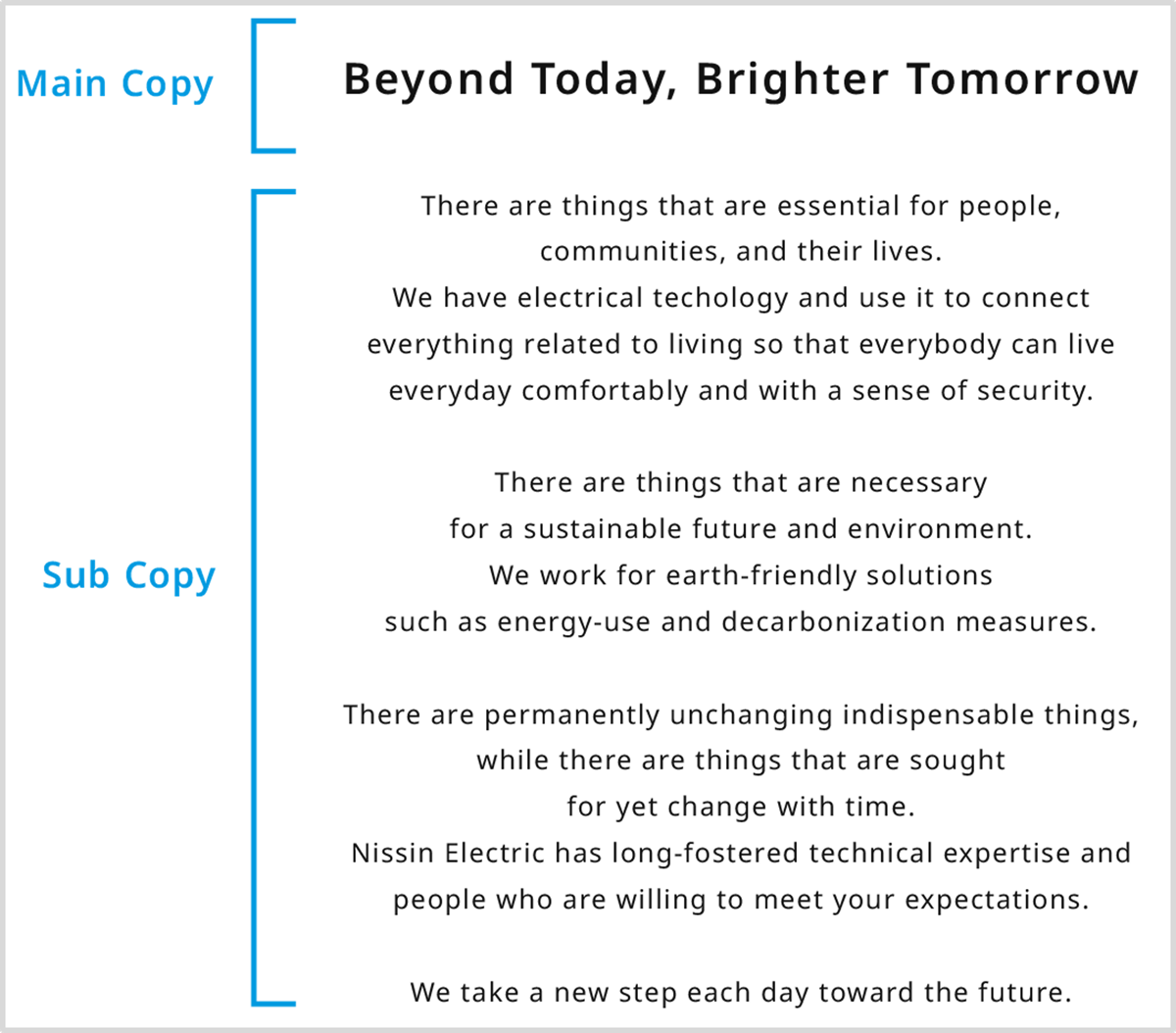 The above message consists of two parts: the main copy and a sub copy. The main copy expresses Nissin Electric’s unique wishes and beliefs, while the sub copy conveys the relationship between its business and society and what the company has cultivated over the years.