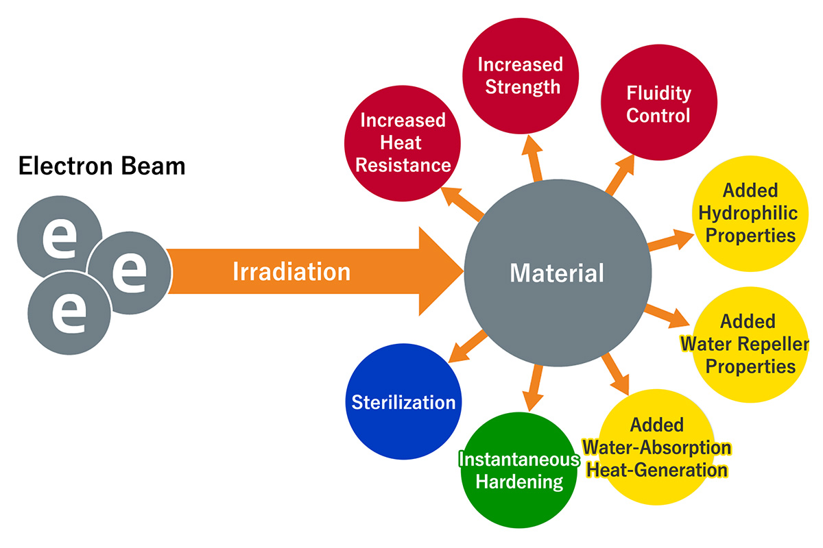 Materials irradiated with electron beams (EBs) undergo various chemical reactions, which improve the properties of the material and/or add new functionality. Moreover, compared to traditional processes utilizing heat or light, electron beam processing offers high energy efficiency and substantially reduces electricity cost because electron beams directly work on the molecular structure of the material. The process is used to improve fuel efficiency by means of reducing tire weight and extend food storage periods and reduce food losses by means of improving the performance of food packaging films.