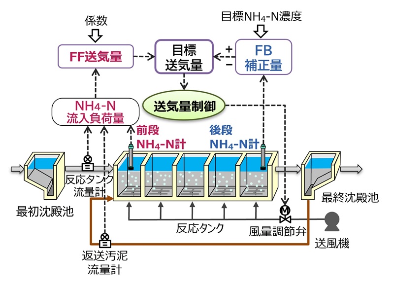 本技術は、反応タンク内の上流側に設置したNH4-N計の計測値(以下、前段NH4-N濃度)によるフィードフォワード(FF)制御と、下流側に設置したNH4-N計の計測値(以下、後段NH4-N濃度)によるフィードバック(FB)補正を組み合わせて反応タンク送気量の自動制御を行う技術です。