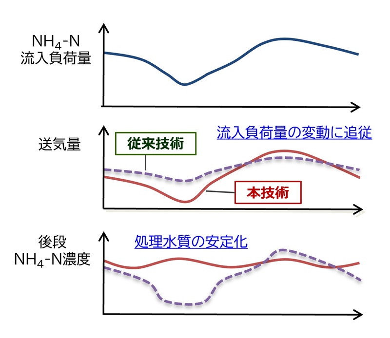 従来技術では、流入負荷量が低い時間帯もDO(溶存酸素)濃度が目標値となるよう送気量を制御するため、必要酸素量に対して送気量が過剰になりやすい傾向があります。一方で、流入負荷量が急激に増加した場合は、制御動作の遅れにより送気量が不足し、硝化の進行が不完全になることが懸念されます。
