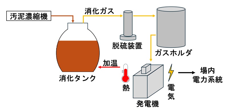 下水処理施設で回収された下水汚泥は濃縮消化タンクに投入されますが、タンク中では微生物の働きにより消化ガスが発生します。消化ガスはメタンと二酸化炭素を含んだ可燃性ガスであり、温室効果ガスであることから大気放出ができません。そのため、従来は消化タンクを加熱するためのボイラー燃料として使用するか、焼却処分していました。