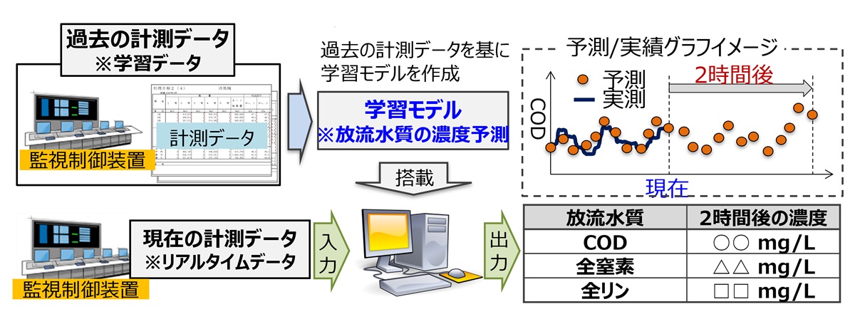 特に、AIが過去の実績データを基にして将来の水質変動を予測し、それに基づいて維持管理者が水質悪化を未然に防ぐことができれば、維持管理者の負担を軽減できます。当社は、このような技術を開発し、運転管理の効率化に向けた取組みを実施しています。